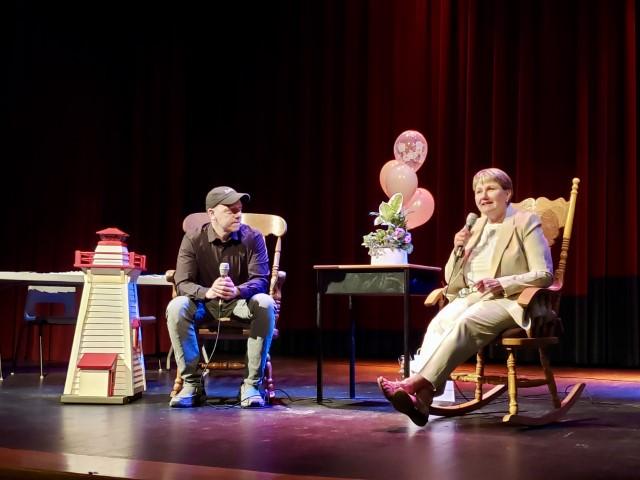 (Jeremy Parent et Marie O’Brien ont développé une profonde amitié et un grand respect mutuel. Sur la scène, le phare que l’auteure a offert à son éditeur. Crédit : Damien Dauphin)